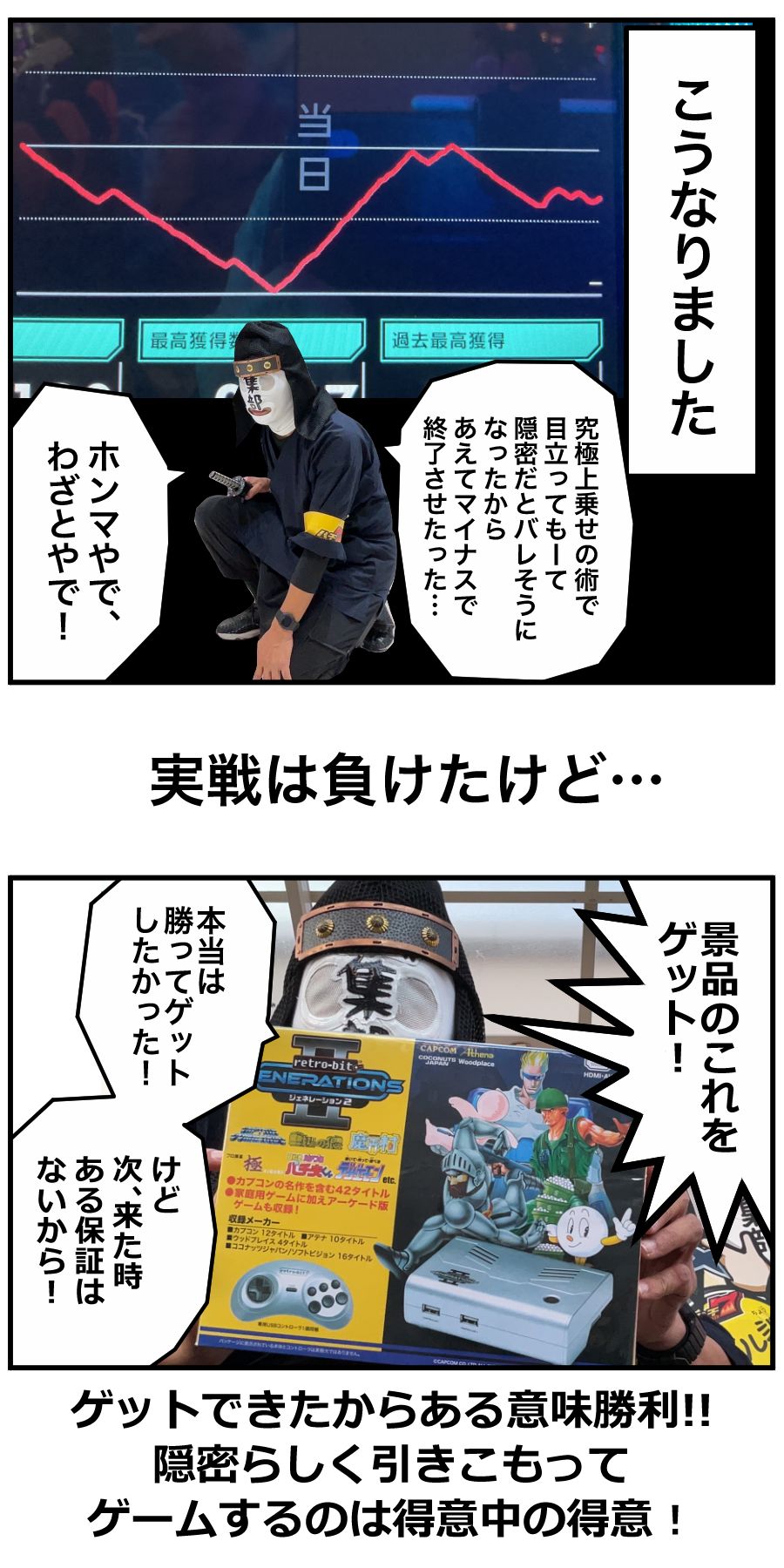 スロ、パチの勝率は…まあ、そこはええやん。目押しレベルは3(10段階)。