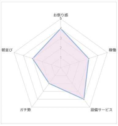 | 稼働 | ピーク稼働はパチスロ約6割。パチンコは約3割程。 |