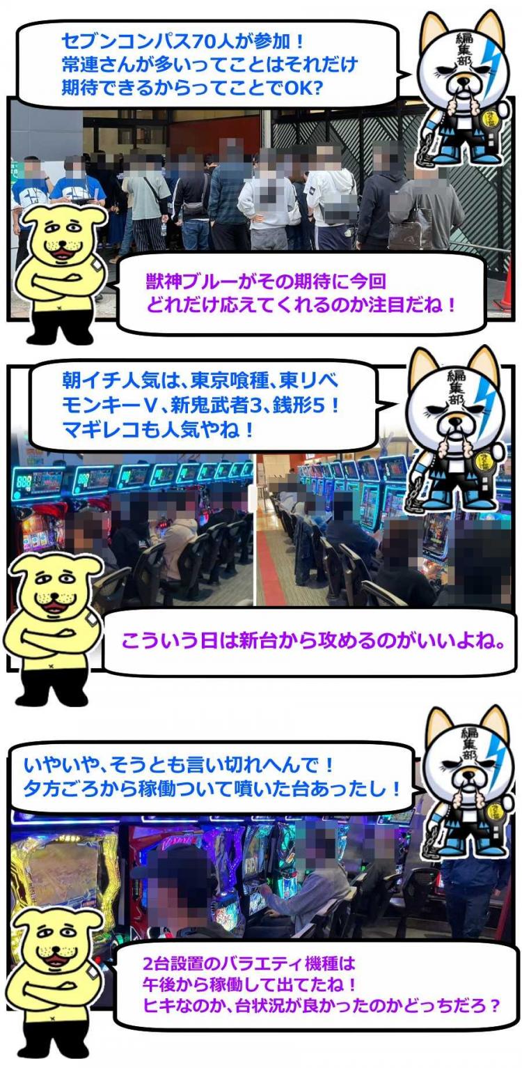 | 朝並び | セブンコンパス抽選人数:70人 セブンコンパス入場人数:51人 一般入場:29人 ※1パチは入場口別で並び順になってます。 |
