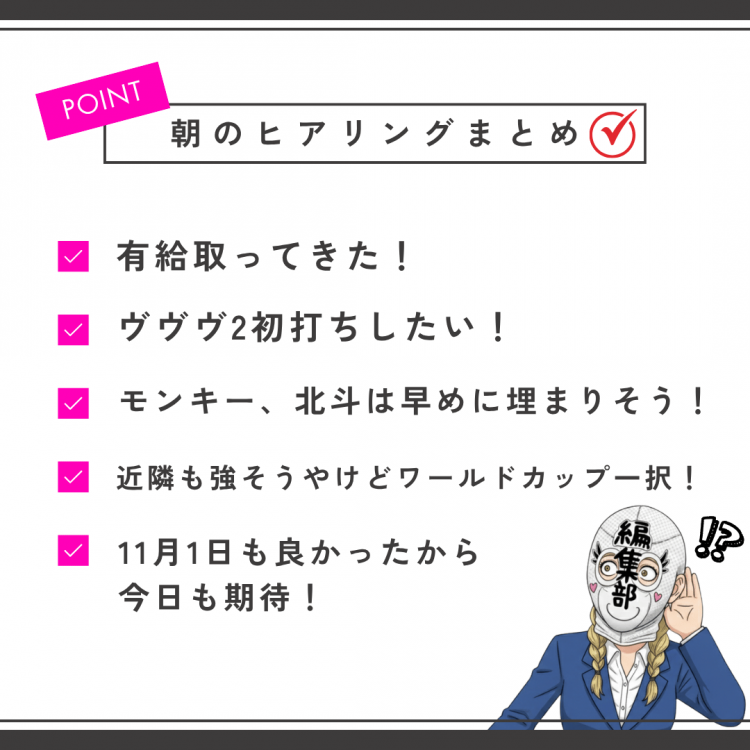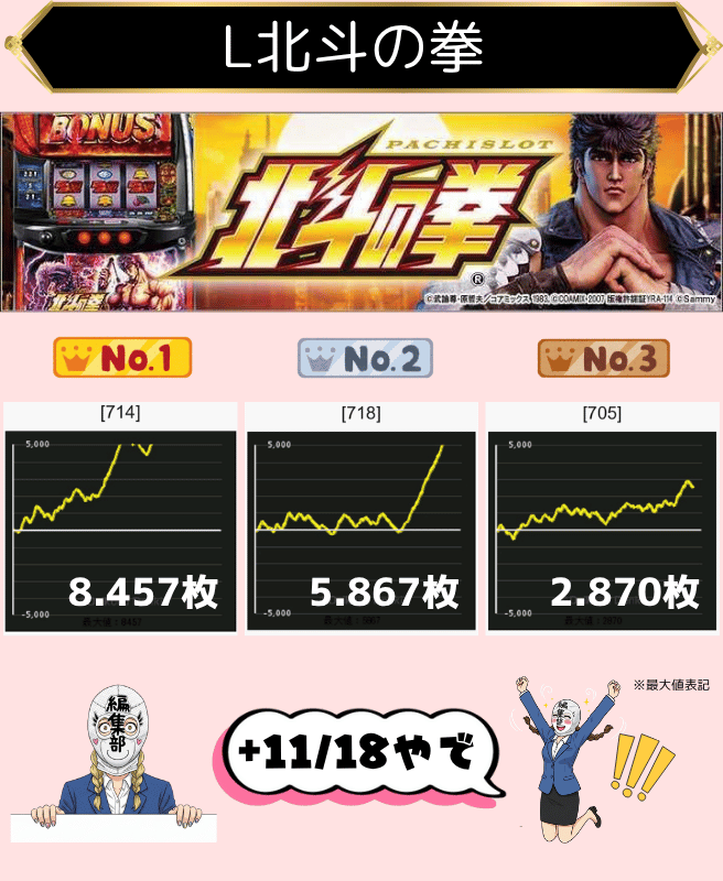特に朝イチ人気の高かったモンキーや北斗は機種別でみても勝率が高く、確信を持って楽しまれているユーザーさんもいらっしゃいました(*^^*)