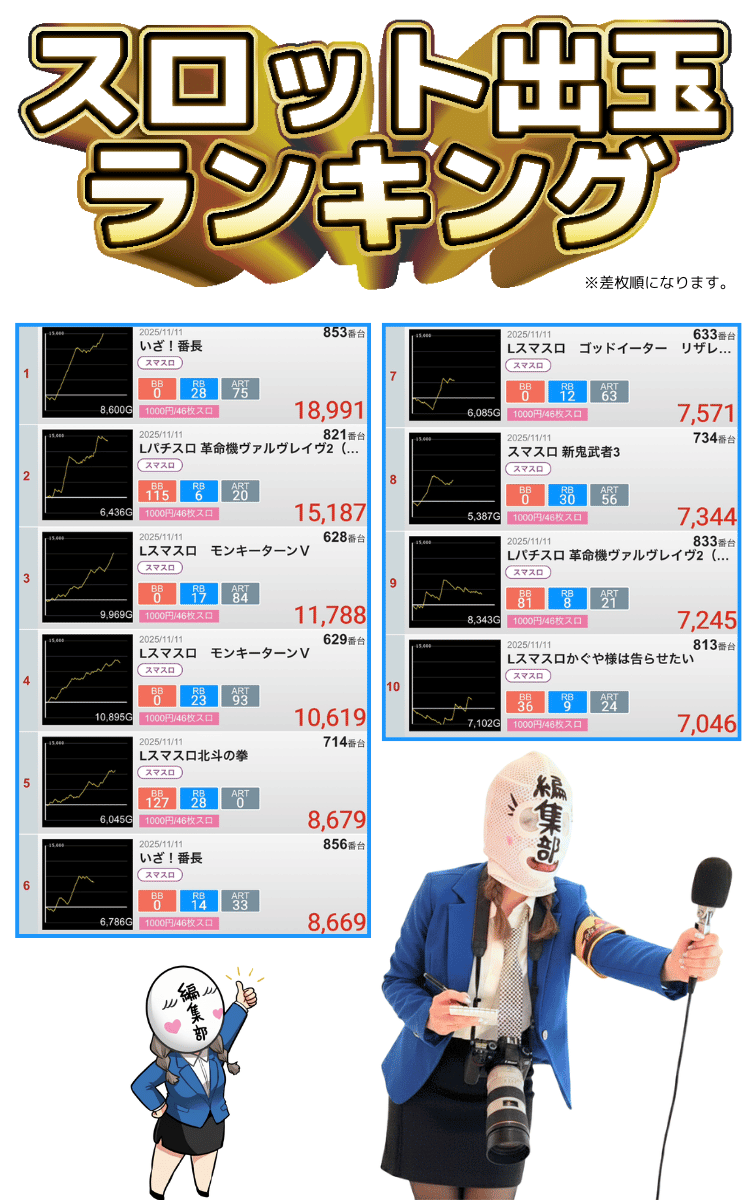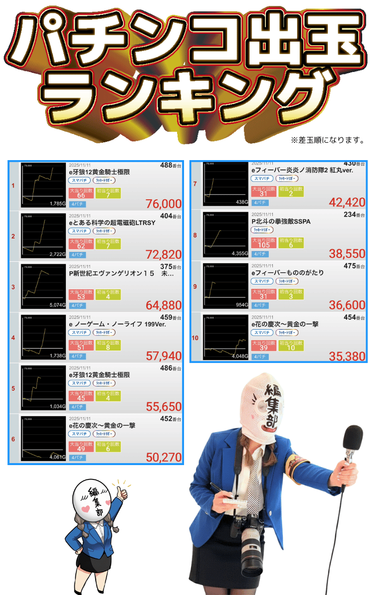 パチンコエリアではe牙狼12、e超電磁砲が7万発超えでランクイン!
