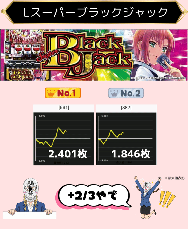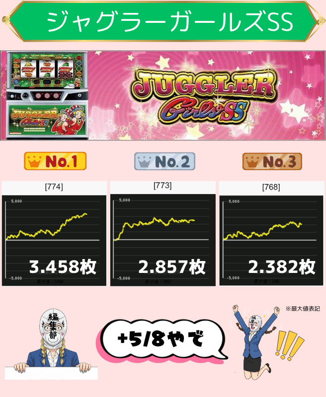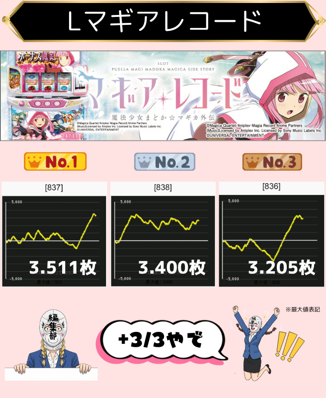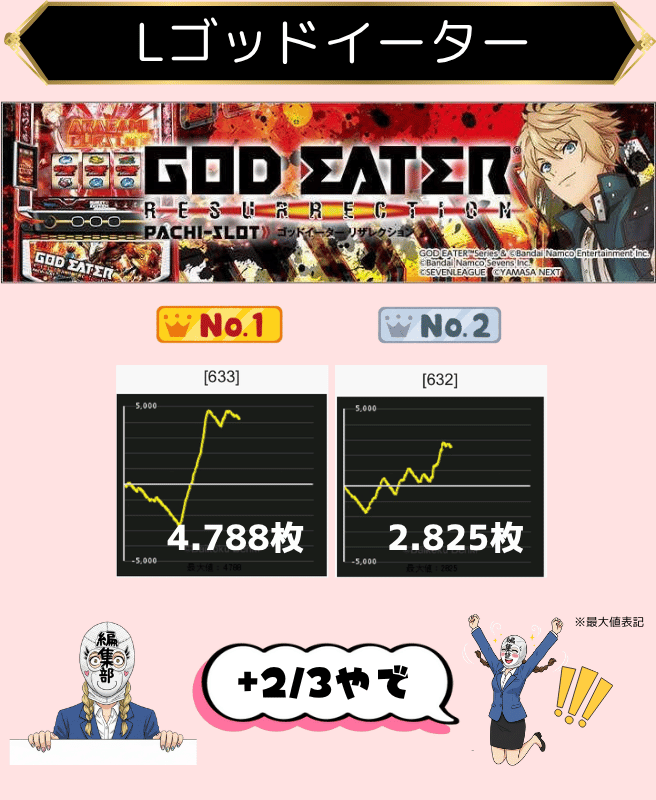 SBJ、マギレコ、ゴッドイーターなど3台設置機種からも好成績台が見えていて、スマスロエリア満遍なく楽しめたようです♡