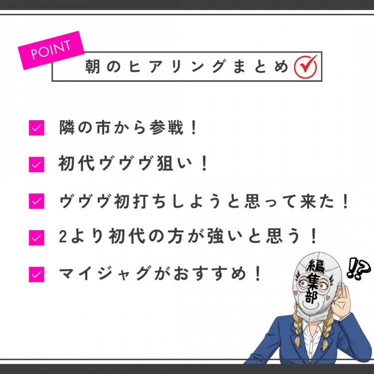 ヴヴヴエリアは朝から粘られる方も多く良きお声も聞こえていたことから、今回もしっかりユーザーを楽しませる状況になっていたようです(*´ω`)