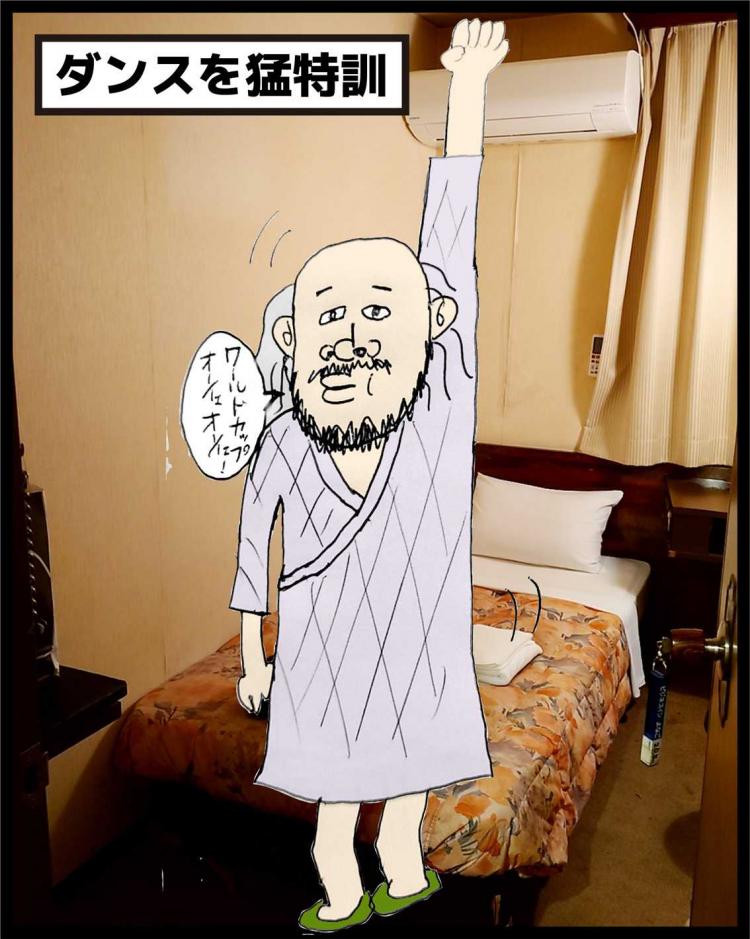 …その裏には前夜のホテルでひとり猛特訓する中年の姿が…。