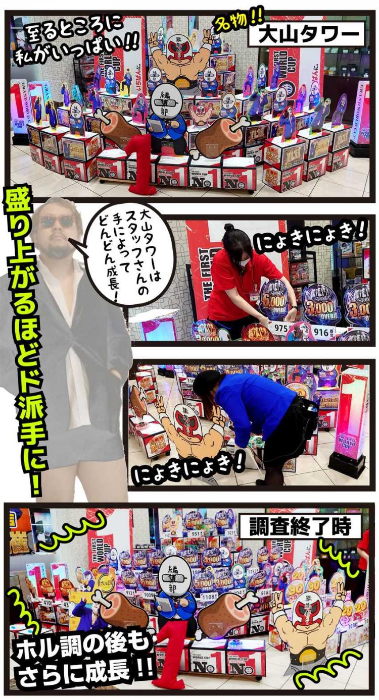 『グランワールドカップ米子店』の常連マスクであるますくofちゅうが、鳥取の名峰・大山になぞらえて“大山タワー”と呼んでいる、当ホールの名物でもある出玉ディスプレイは、今回のホル調でも健在!